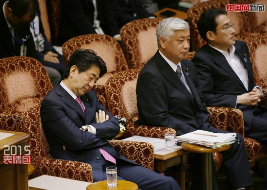 当地时间2015年9月17日,日本东京,执政联盟计划强推安保法案在特别委员会表决通过,但审议听证会受阻迟迟未开始。日本首相安倍晋三、防卫大臣中谷元、外长岸田文雄和一些议员等候审议听证会开始,他们疲惫不堪难掩睡意。图为日本首相安倍打瞌睡。