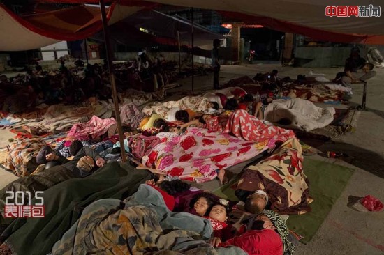 当地时间2015年5月12日,尼泊尔加德满都,地震发生后,民众露宿街头,睡在空地上。当天,尼泊尔再次发生7.5强烈地震,当地媒体报道的死亡人数已达47人。