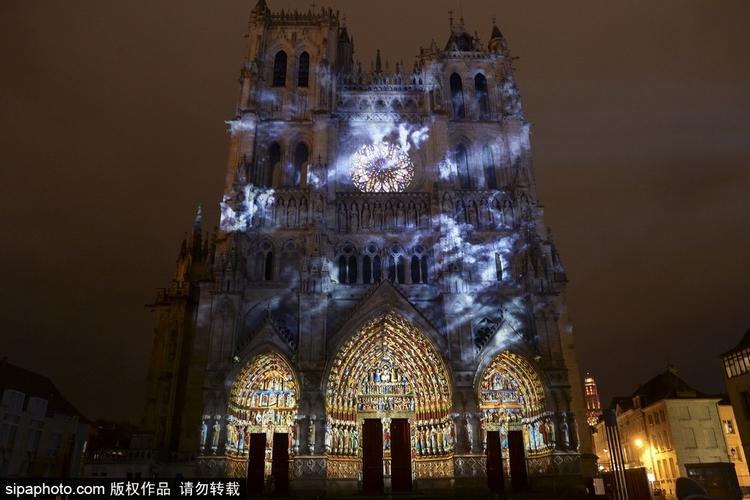 当地时间2015年12月16日,法国亚眠,从现在至2016年1月1日,亚眠大教堂每天晚上7点就会点亮色彩秀。明亮的色彩展示了中世纪的辉煌,刻在石壁上的13世纪的圣徒、使徒和其他人物似乎又重生了,游客只能通过自己的眼睛去感受中世纪人的情感。
