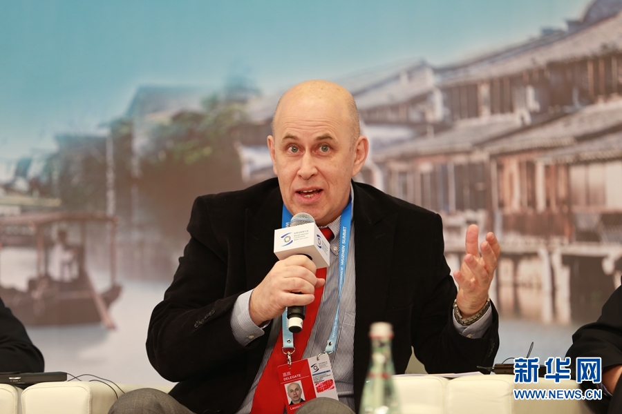 12月17日,第二届世界互联网大会“互联网文化与传播论坛”互联网时代的文化传承与创新议题在乌镇华美宫举行,亚太地区国家和地区顶级域名联合组织总经理莱昂尼德·托多洛夫发言。新华网 祝立铭 摄