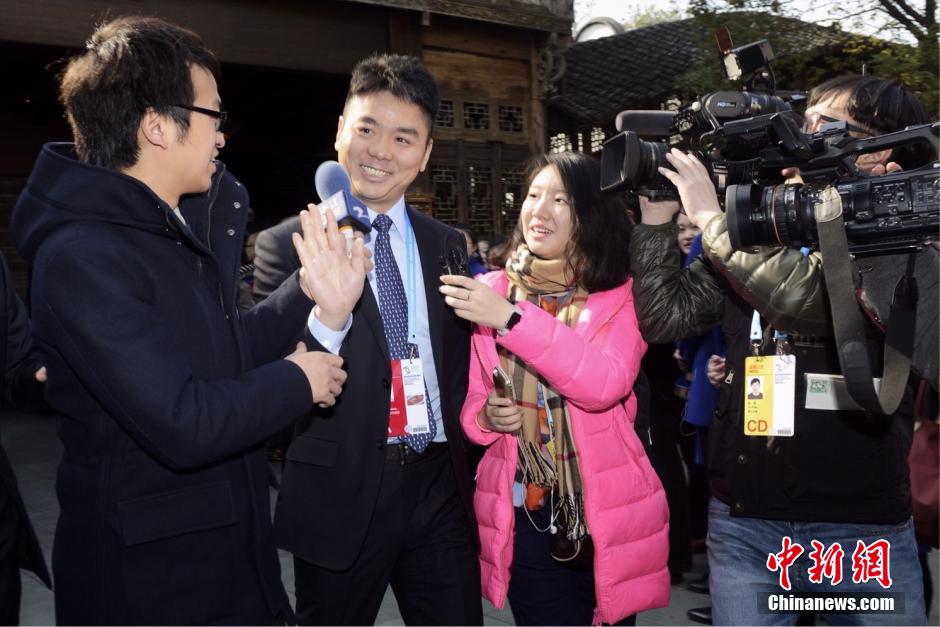 2015年12月16日,浙江省嘉兴市,当日中午,第二届世界互联网大会·乌镇峰会开幕式结束后,马云、雷军、李彦宏、张朝阳、柳传志等互联网科技大咖们从会场走出,向久等的“粉丝”们招手。图为刘强东。
