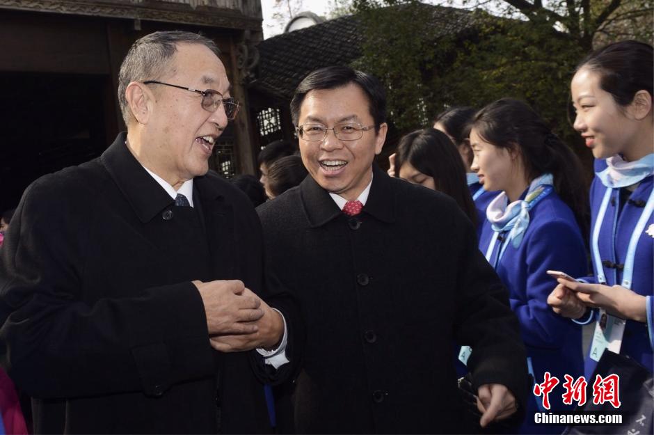 2015年12月16日,浙江省嘉兴市,当日中午,第二届世界互联网大会·乌镇峰会开幕式结束后,马云、雷军、李彦宏、张朝阳、柳传志等互联网科技大咖们从会场走出,向久等的“粉丝”们招手。图为柳传志(左一)。