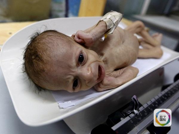 资料:7月30日,也门首都萨那,6个月大的婴儿塔瓦阿里在体重称上哭号,他严重营养不良,体重仅有2千克。(图片来源:新华/路透)
