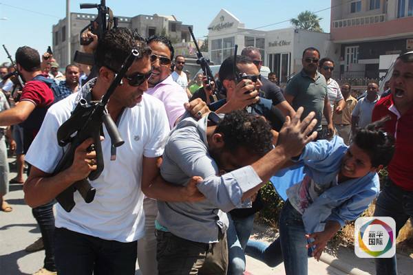 图为6月26日,在突尼斯旅游城市苏塞的警察控制一名疑似开枪的武装分子(中)。(新华社/欧新)