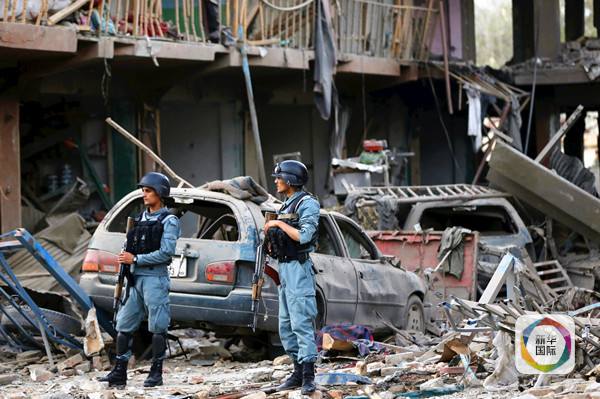 图为8月7日,在阿富汗首都喀布尔的两名警察在汽车炸弹袭击事发现场守卫。(新华社/路透)