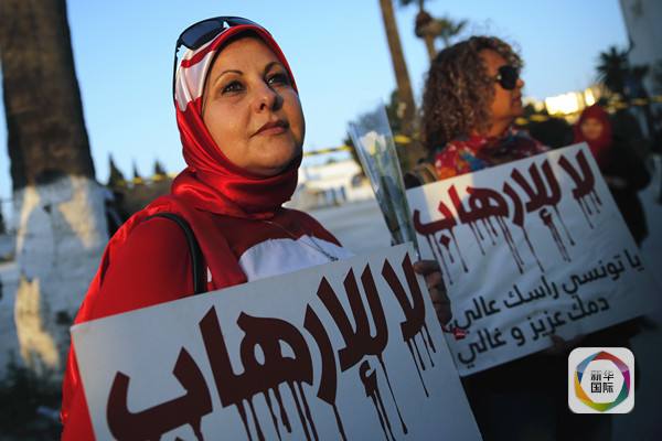图为3月19日,在突尼斯首都突尼斯城的巴尔杜博物馆外,一名妇女在抗议活动中手举写有“拒绝恐怖主义”的标语牌。(新华社/美联)
