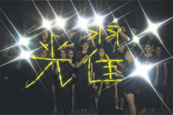 40名青年用萤光棒在黑暗中形成“耀”字,正式揭晓新加坡“字述一年”2015年当选的年度汉字。