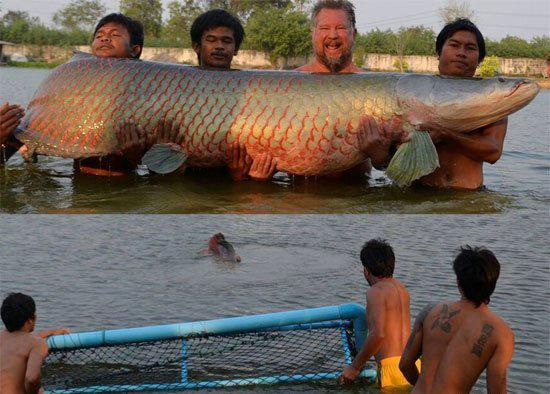 2、泰国4男子捕获460斤的巨骨舌鱼