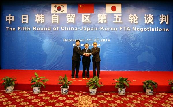 2014年9月1日,在北京举行的中日韩自贸区第五轮谈判开幕式上,韩国产业通商资源部部长助理禹泰熙、中国商务部部长助理王受文、日本外务省副部级审议官长岭安政(从左至右)握手合影。(新华社记者邢广利摄)