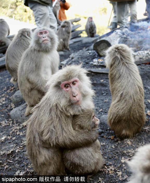 当地时间2015年12月20日,日本,日本猿猴中心一群猕猴在篝火旁取暖,吃烤红薯萌态十足。(图片来源:Sipa Photo)
