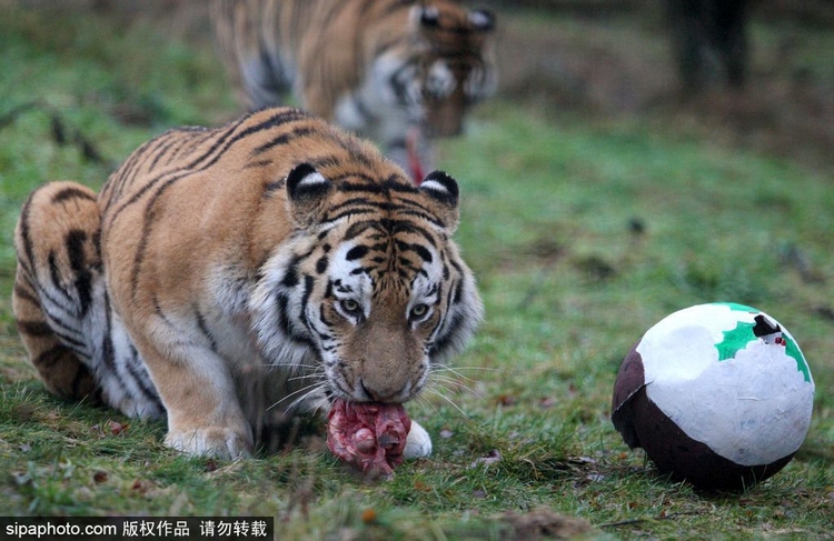 近日,苏格兰,高原野生动物园里的一直老虎当日得到了圣诞美味,美食被包裹在一个圆形的球内,老虎吃东西样子蠢萌蠢萌的。(图片来源:Sipa Photo)