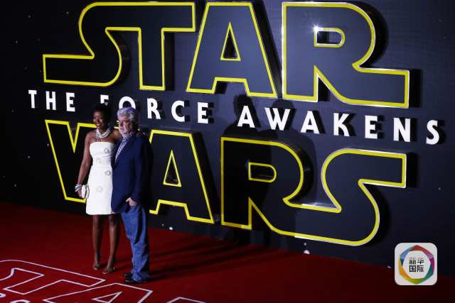 2015年12月16日,乔治·卢卡斯(右)在英国伦敦出席《星球大战:原力觉醒》欧洲首映式。
