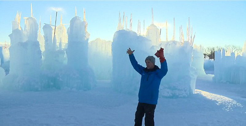 艺术家克里斯滕森展示自己在加拿大埃德蒙顿建造的半完工冰冻城堡。(网页截图)