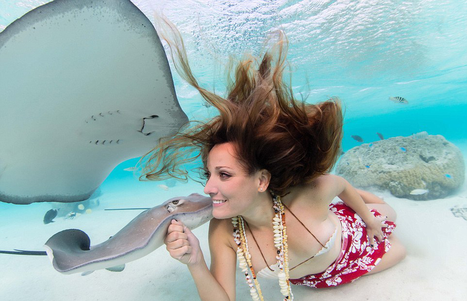 冒生命危险 比基尼美女与黄貂鱼亲密共泳(组图)