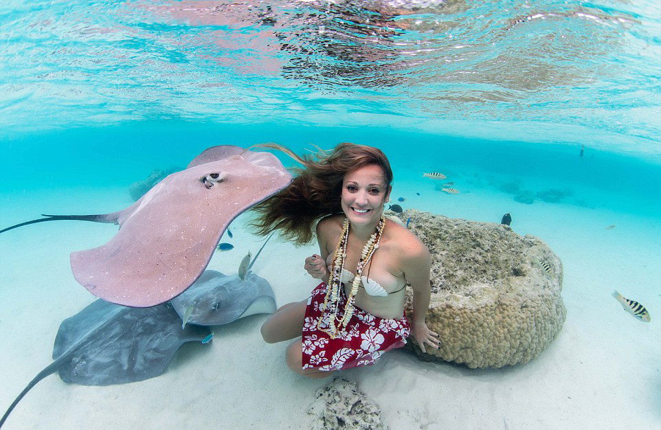 冒生命危险 比基尼美女与黄貂鱼亲密共泳(组图)