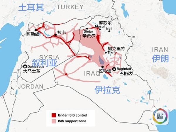 “伊斯兰国”控制区域(红色)和影响区域(粉红)示意图。