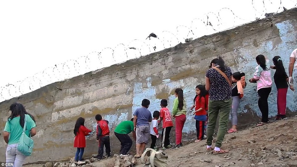 这道墙上头还装设了铁丝网,住在贫民窟这一头的民众,爬上梯子,想一窥对面的世界,附设游泳池的豪宅,生活水平和他们简陋的房子相比有如天壤之别。图为儿童参加活动在这堵墙上涂鸦。