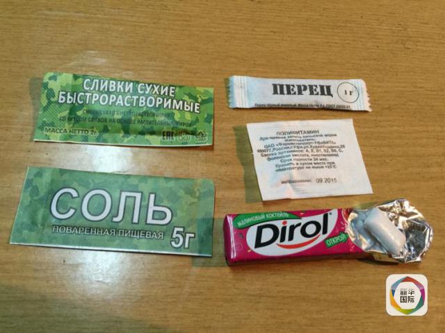 其余还有:5克盐(左下)、1包口香糖(右下)、1克胡椒(右上)和一袋可冲泡奶油粉(左上,早上喝)。值得一提的是右中那袋一粒胶囊,药名为多种维生素,含维生素A、E、B1、B2、B6、C。