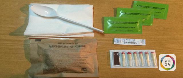 此外,还有3张纸巾、3张消毒纸巾(右上)、几根经特殊处理延长燃烧时间的火柴(右下)、一包便携加热器(左下)和3粒净水剂。