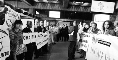 抗议者在世界贸易组织第十界部长级会议外高呼“不要新方案”等口号。(王新俊摄)