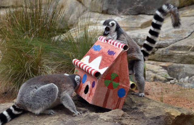 在澳大利亚悉尼的塔朗加动物园,两只环尾狐猴“好奇地”拨弄动物园特意为它们准备的圣诞礼物。
