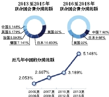 按照12月23日通过的2016年-2018年联合国经常预算的分摊比额,中国应缴纳会费比额从2013年-2015年的5.148%上升至7.921%,仅次于美国的22%和日本的9.68%,位居会员国第三位。