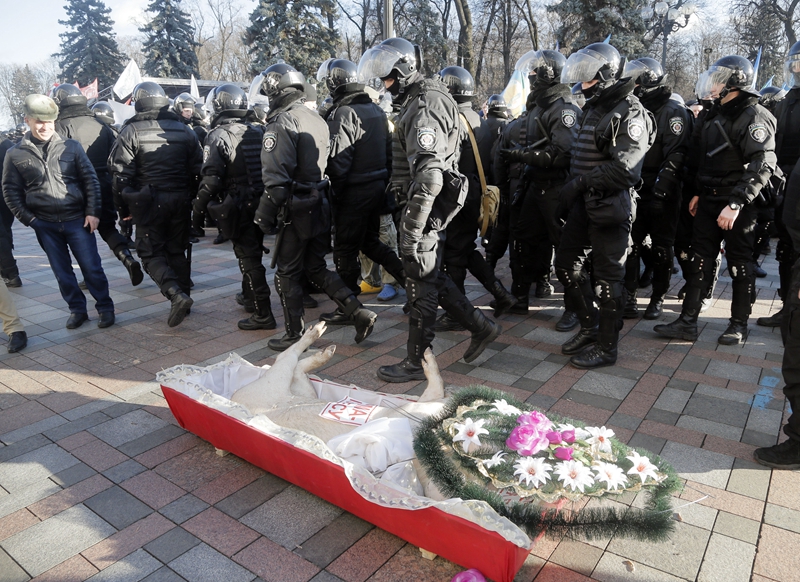 据美联社报道,当地时间2015年12月24日,乌克兰基辅,示威者抬着放有一头猪的“棺材”与执法人员对峙。农民和其支持者在议会外抗议国家预算可能出现的变化和农业部门税务条例。(图片来源:美联社)