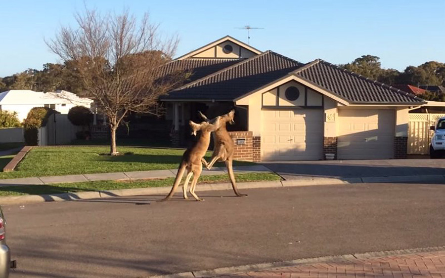 据外媒日前报道,普通人街头打架经常见,但是两只袋鼠在光天化日下当街大打出手就有些少见了。近日,有人拍到两只成年雄性袋鼠在澳大利亚新南威尔士州的大街上公然斗殴五分钟。