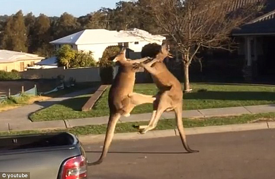 近日,有人拍到两只成年雄性袋鼠在澳大利亚新南威尔士州的大街上公然斗殴五分钟。