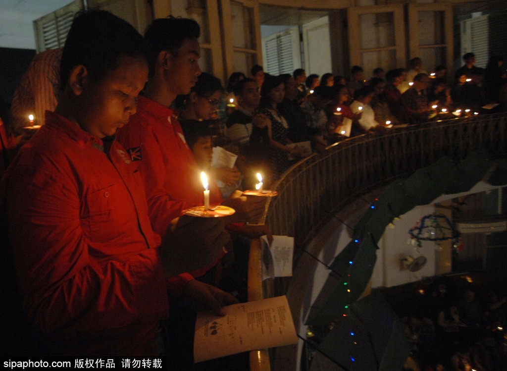 当地时间2015年12月24日,印度尼西亚雅加达,平安夜,基督教信徒在玛内利教堂(Immanuel Church)做弥撒祈福。