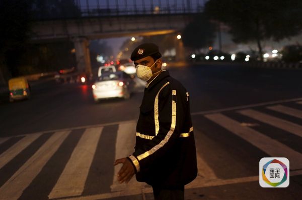 2015年12月23日,新德里,交通警察戴口罩指挥交通。(图片来源:新华/路透)