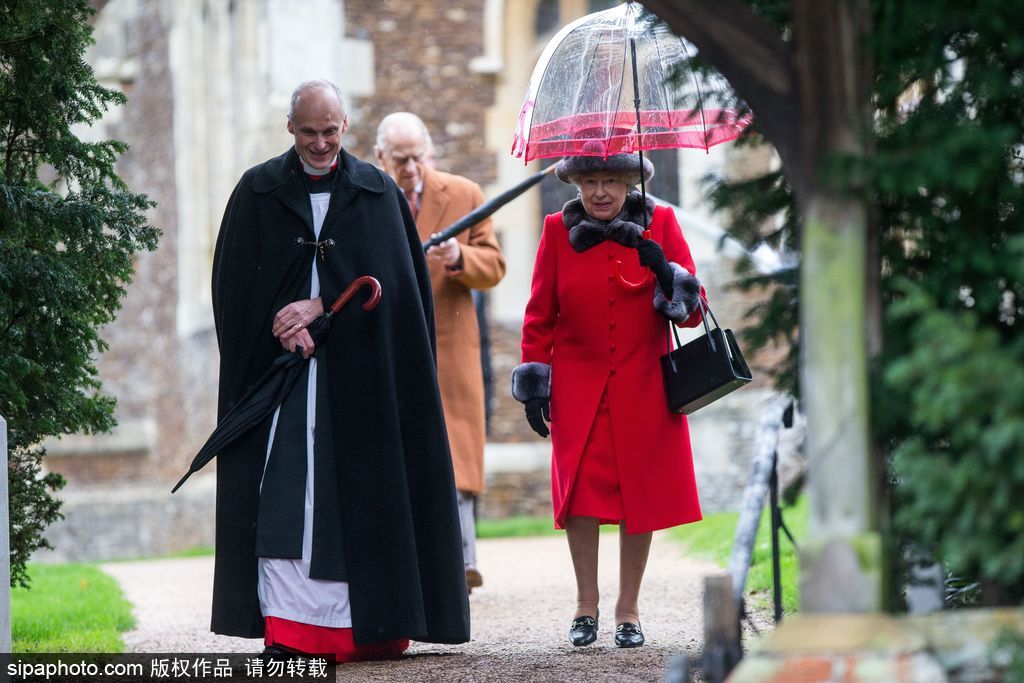 当地时间2015年12月25日,英国诺福克桑德林汉姆庄园,英国王室成员出席教堂圣诞节礼拜。(图片来源:希帕中国)