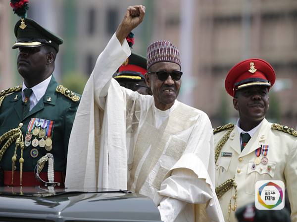 今年5月29日,在尼日利亚首都阿布贾,尼新总统布哈里(中)在就职典礼上向支持者致意。