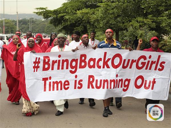 尼日利亚民众手持横幅要求政府解救被“博科圣地”绑架的200多名女学生。