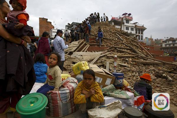 4月25日,尼泊尔中部地区突发8.1级强烈地震,造成境内约9000人死亡,2.2万多人受伤;地震还导致尼泊尔文物损毁严重。这是该国80多年来发生的最大自然灾难。图为人们带着随身物品坐在一座倒塌的寺庙外。