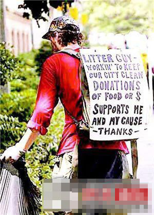 加拿大乞丐以捡垃圾换取“捐助”。 在我们的印象中,乞丐总是可怜兮兮地站在街头的某个地方等待人们的施舍。但在加拿大的多伦多,一位行乞的男子改变了这种做法,他每天都主动在 大街上收集垃圾,以此换取人们对他的“捐助”。他的行为已在多伦多引起积极的反响。