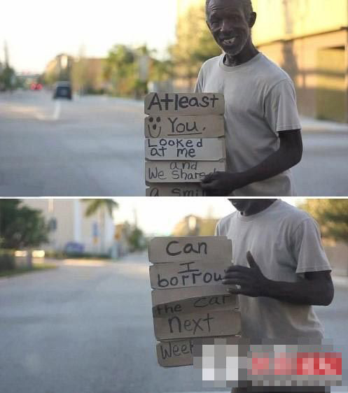 美国迈阿密市中心的一个乞讨者精心设计了翻牌标语翻牌吸引路,并且在瞬间就能变换内容。
