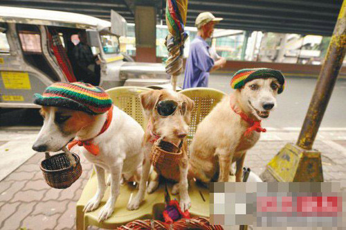 菲律宾马尼拉街头狗代替主人行乞。 2010年7月22日,戴着帽子和墨镜的狗在菲律宾马尼拉街头代替主人行乞。