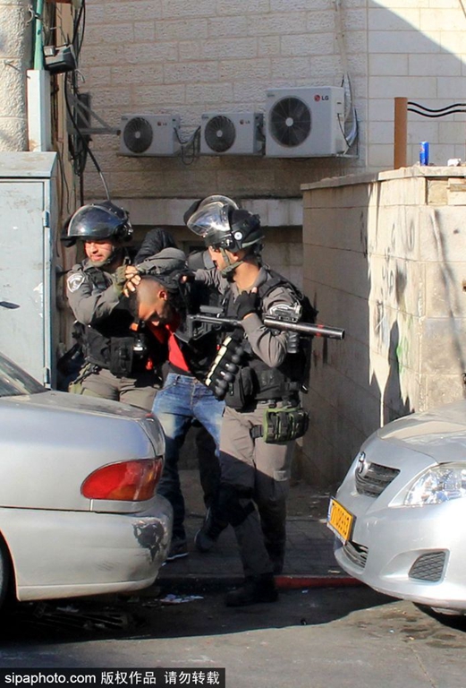 当地时间2015年12月26日,以色列耶路撒冷,巴勒斯坦民众在大马士革门外举行抗议活动,以色列安全部队驱散抗议者。(图片来源:希帕中国)