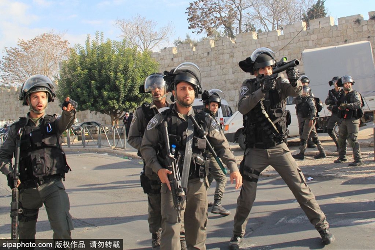 当地时间2015年12月26日,以色列耶路撒冷,巴勒斯坦民众在大马士革门外举行抗议活动,以色列安全部队驱散抗议者。(图片来源:希帕中国)