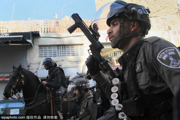 当地时间2015年12月26日,以色列耶路撒冷,巴勒斯坦民众在大马士革门外举行抗议活动,以色列安全部队驱散抗议者。(图片来源:希帕中国)
