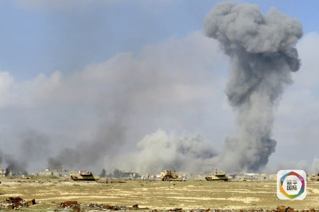 这张2015年11月21日在伊拉克拉马迪郊区拍摄的照片显示,伊拉克安全部队在前往阵地途中,而远处的IS阵地遭到美军主导的空袭后升起浓烟。(新华社/美联)