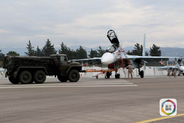 12月16日,在叙利亚西北部拉塔基亚的俄罗斯赫梅明空军基地,俄空军地勤人员为战斗机起飞做准备。叙军方当日说,俄空军在叙方配合下,过去24小时内摧毁叙境内“伊斯兰国”109辆油罐车。(新华社/法新)