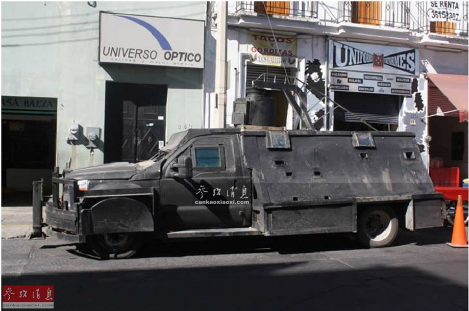 毒枭用皮卡改装的装甲车,后面的车斗侧面似乎开有射击孔。