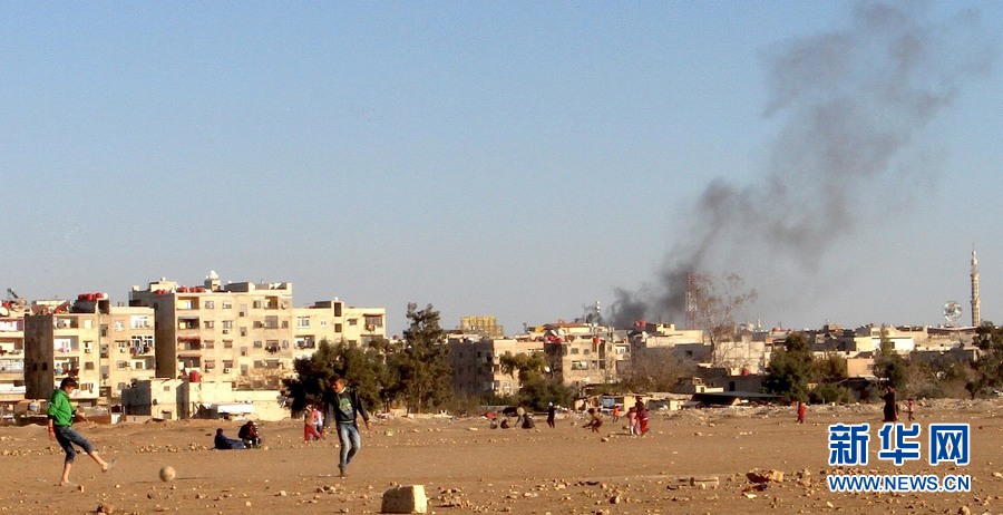 2015年12月28日,叙利亚首都大马士革南郊公路边的一块空地上,孩子们在踢球时,一枚迫击炮弹落在附近,升起黑烟。新华社记者 杨臻 摄
