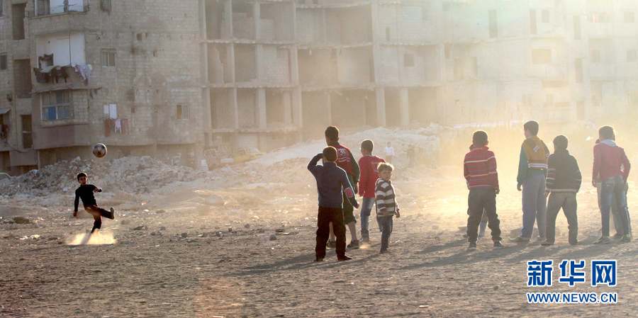 2015年12月28日,一群少年在叙利亚首都大马士革南郊公路边的一块空地上踢足球,一名少年开出角球。新华社记者 杨臻 摄