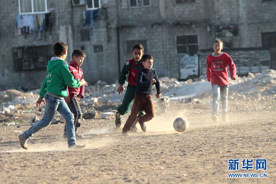 2015年12月28日,一群少年在叙利亚首都大马士革南郊公路边的一块空地上踢足球,一名少年带球突破。新华社记者 杨臻 摄