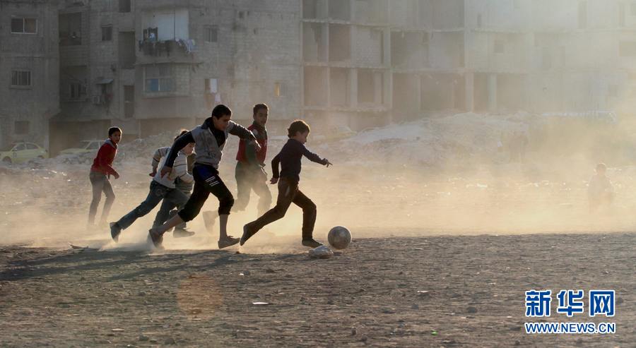 2015年12月28日,一群少年在叙利亚首都大马士革南郊公路边的一块空地上踢足球,一名少年突破防守,起脚射门。新华社记者 杨臻 摄