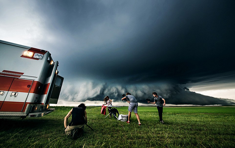 据英国《每日邮报》12月28日报道,加拿大一名风暴追逐摄影师穿越美国7个州拍摄暴雨、冰雹、雷电等极端天气,其朋友和粉丝竞相帮助做其模特,在极端天气中做着最平常的事情,其作品成为公益宣传片,警示着人们天气变化的影响。