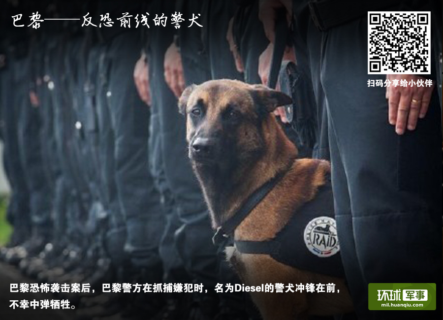 案后,巴黎警方在抓捕嫌犯时,名为Diesel的警犬冲锋在前,不幸中弹牺牲。